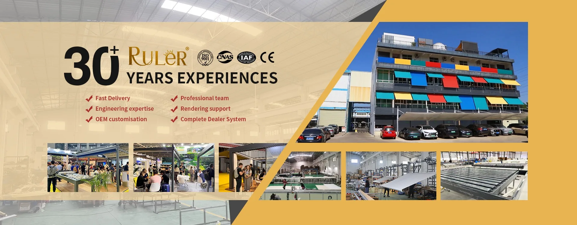 Ruler Outdoor Company is specialise in all kinds of outdoor sunshades products including Pergola, retractable awning, full cassette awning, canopy and awning accessories for over 30 years , we already developed more than 100 distributors in China. We are now promoting our market worldwide and looking for professional distributor and agents.